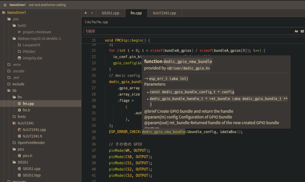 ここでは Fujix さんの ESP32S3 を使ったスーパーな FM 音源プレイヤーである、NanoDrive7 の PlatformIO プロジェクトを Zed で扱えるようにする例で解説します。